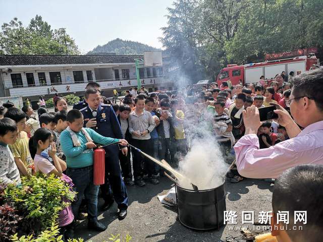 县消防中队消防队员指导学生使用干粉灭火器灭火
